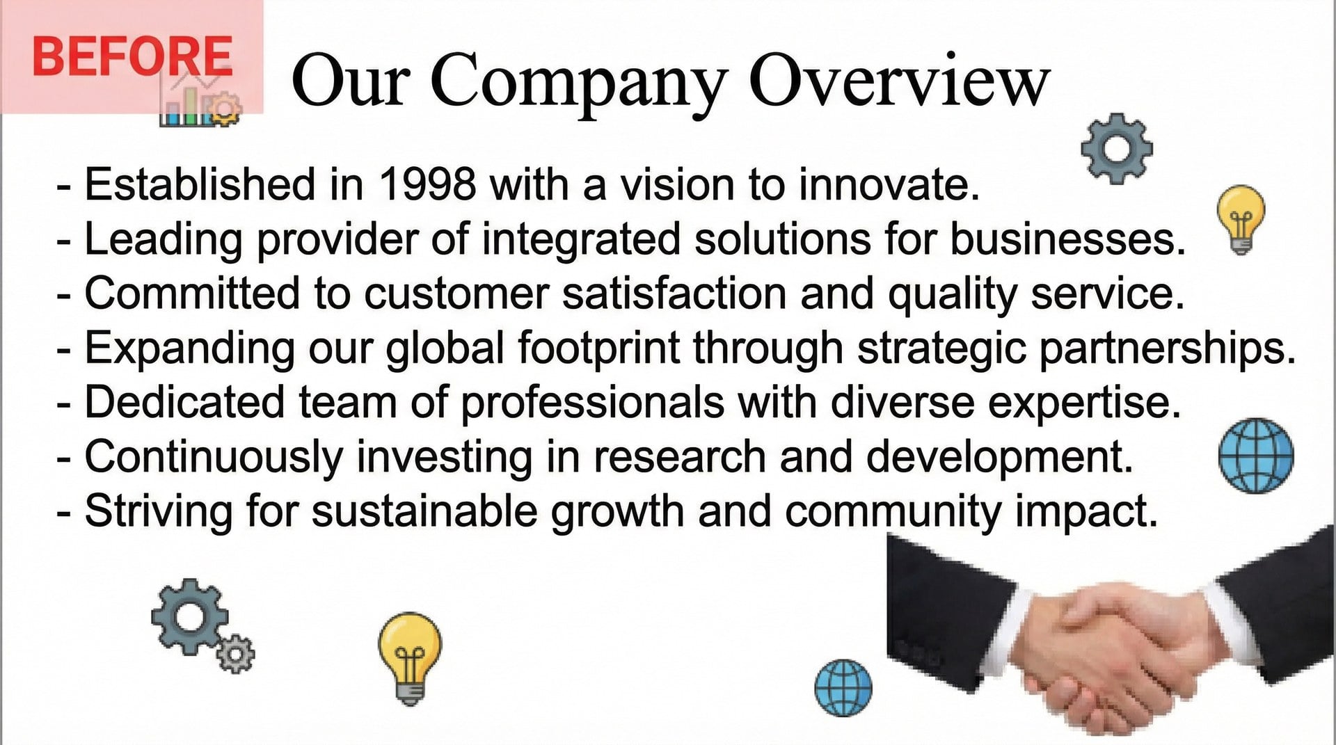 Every deck we build starts with a brief and ends with a presentation that makes an impression. Below are examples of the kind of transformation we deliver — from cluttered, hard-to-read slides to clean, professional decks that command attention.